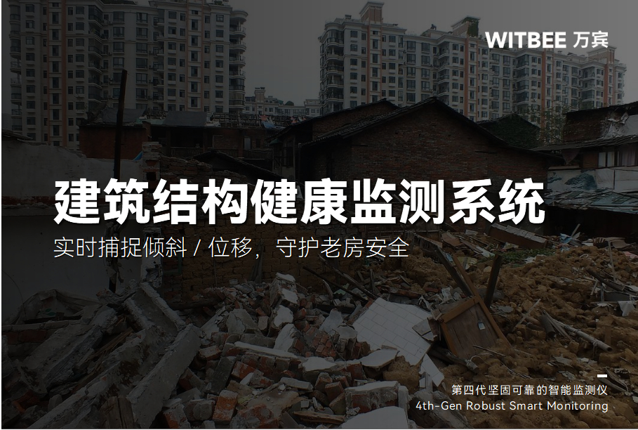 WITBEE?萬賓科技?建筑結構健康監測系統對老舊房屋進行24小時沉降、傾斜、裂縫等指標監測,為加固或拆除決策提供量化依據,守護居民生命安全。